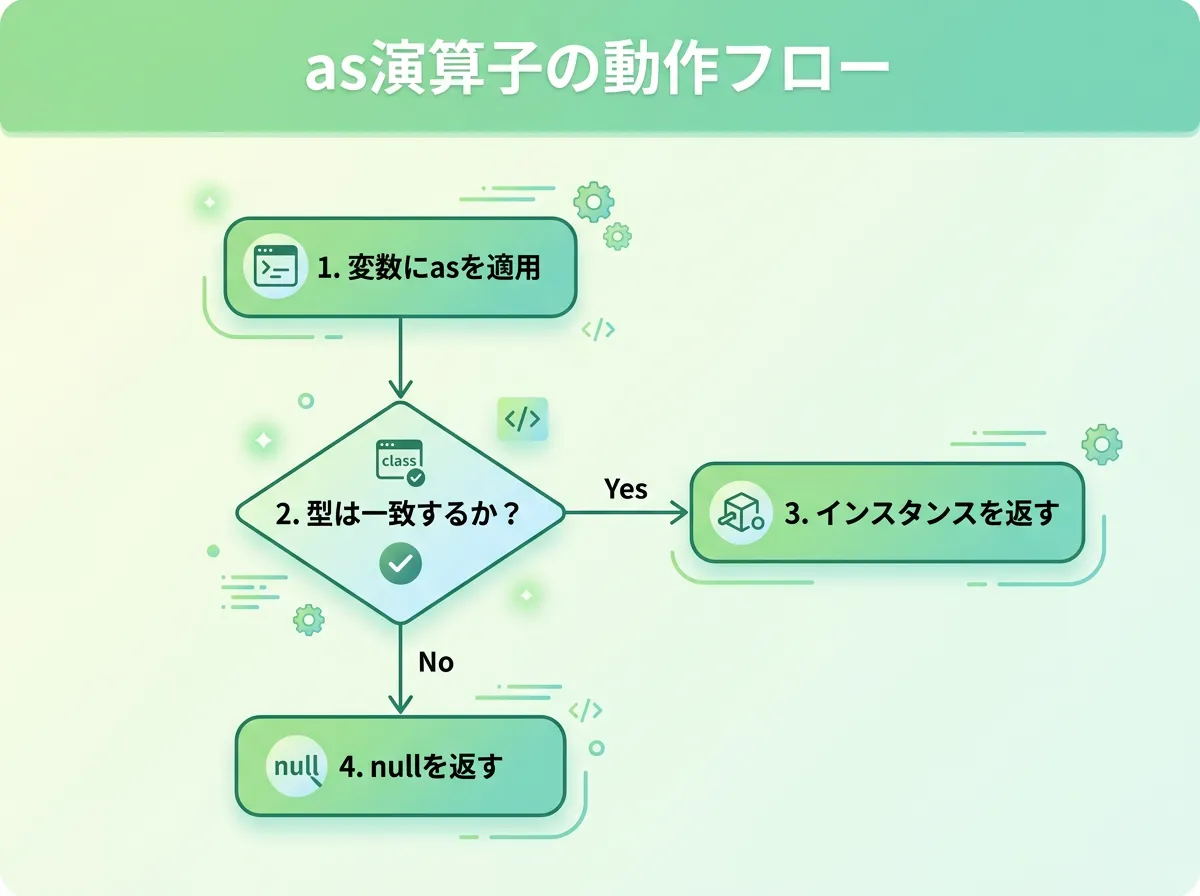 このように、as 演算子を使用する際は、常に「失敗して null が返る可能性」をセットで考える必要があります。