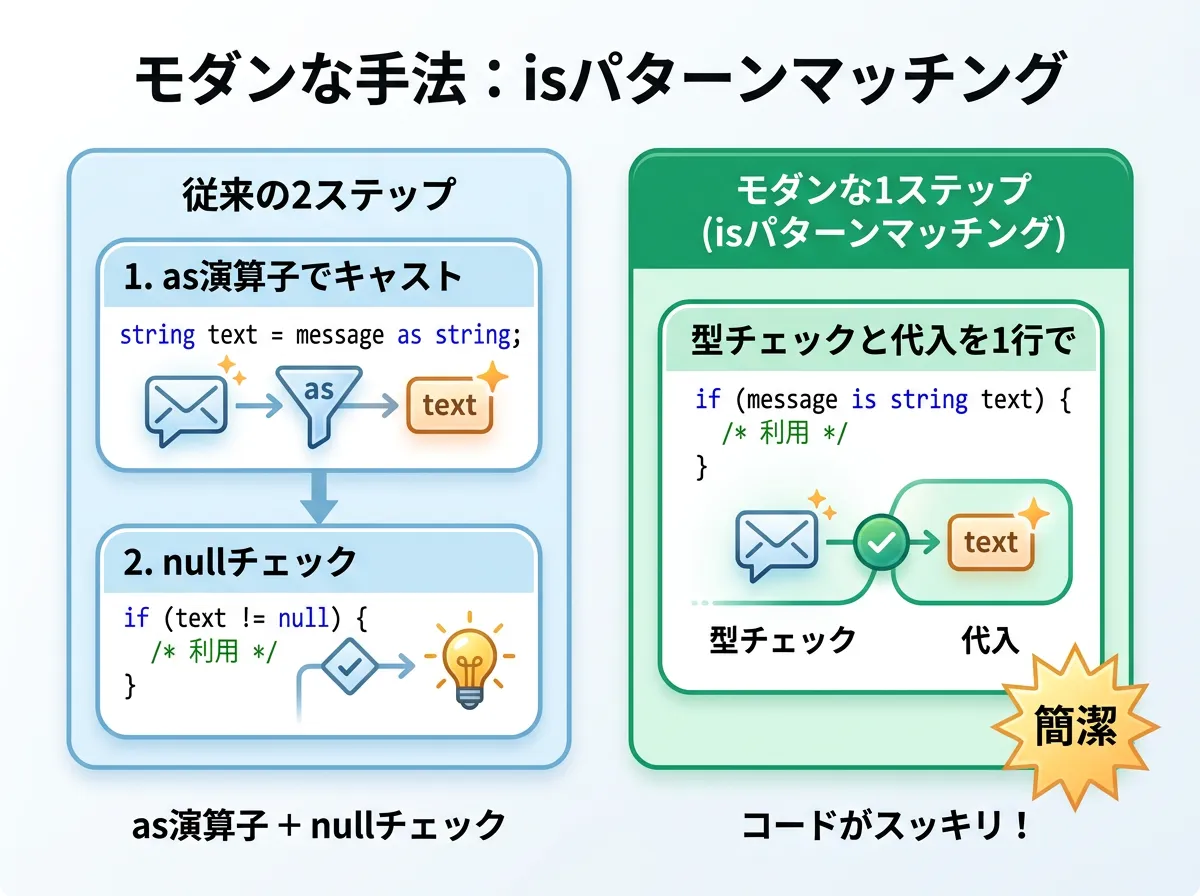 C# 7.0以降、キャストや as に代わるより安全で強力な手法として、is演算子を用いたパターンマッチングが主流となっています。