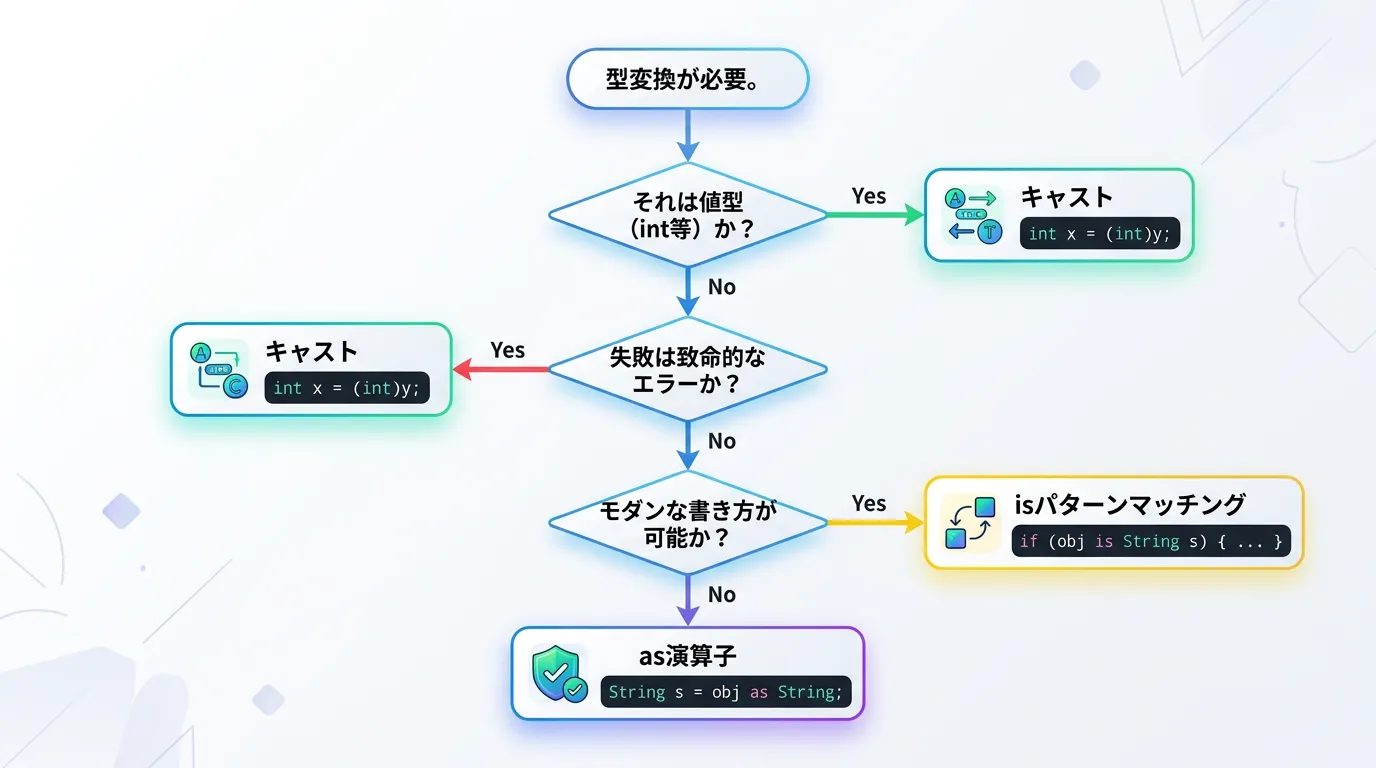 現代のC#開発においては、まず isパターンマッチング による型チェックを第一の選択肢とし、それが適用できない値型の変換や、失敗を即座に検知したい場面に限定してキャストを利用するのが、最も堅牢なコードを書くための近道です。