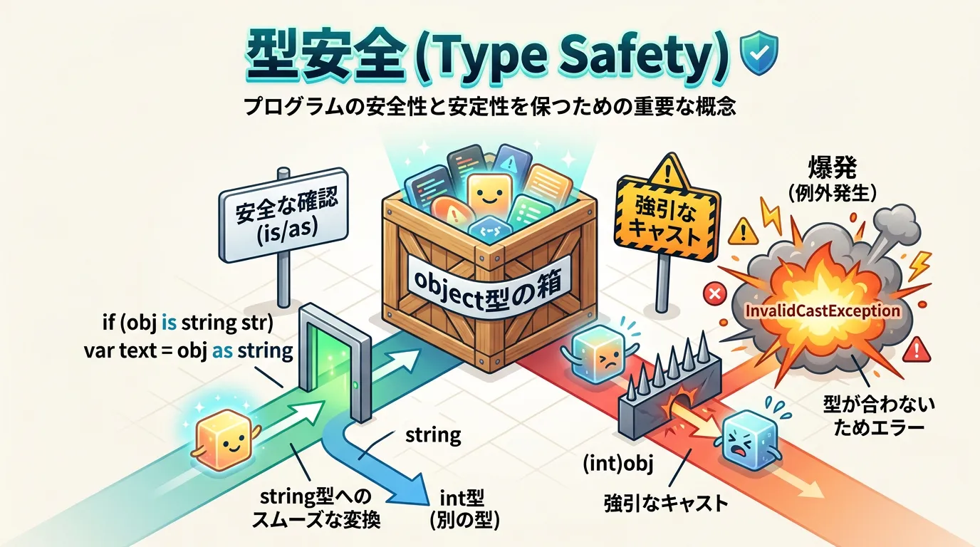 C#は強力な型システムを持つ言語であり、オブジェクトが特定の型であるかどうかを確認したり、別の型に変換したりする操作は日常的に発生します。