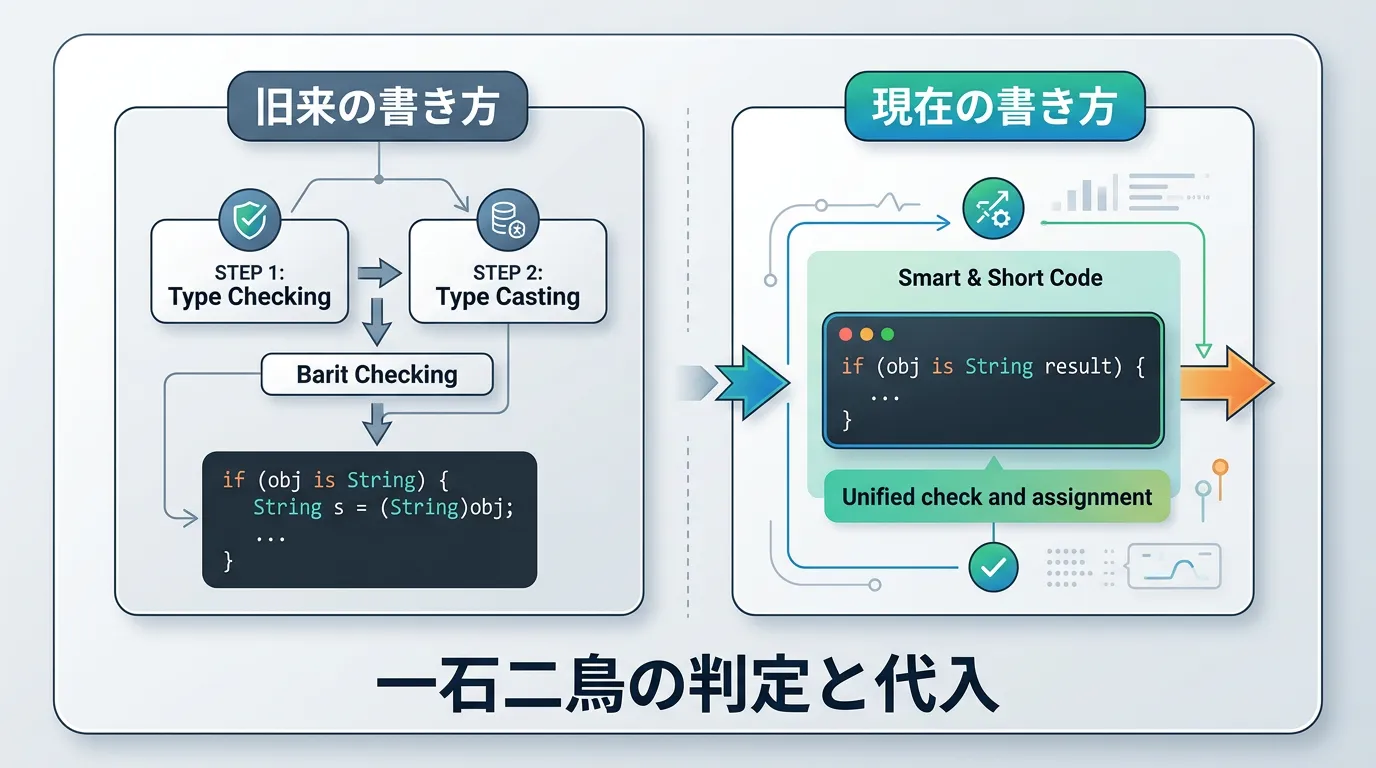 型判定と変数の導入が1行で完結し、スコープもif文の中に限定されるため、最も安全で読みやすいコードになります。