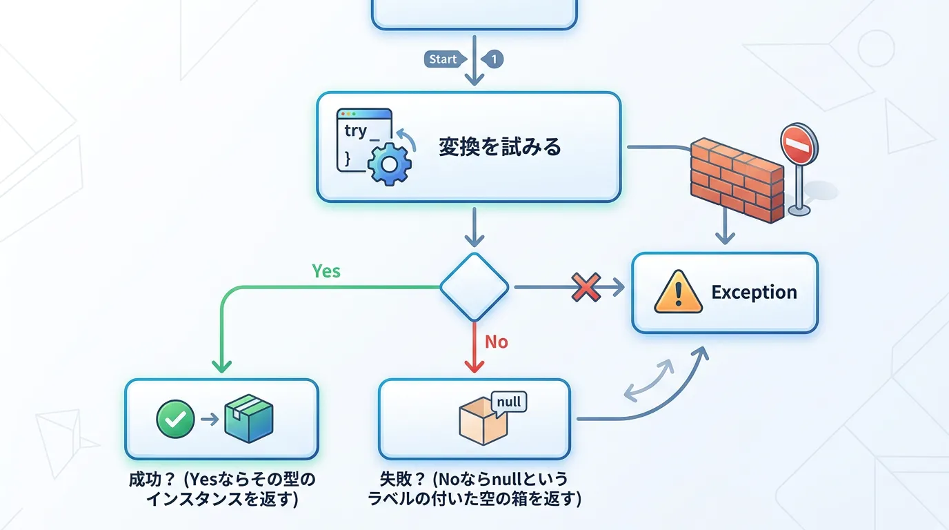| 変換失敗時 | false を返す(変数は未割り当て扱い) | null を返す |