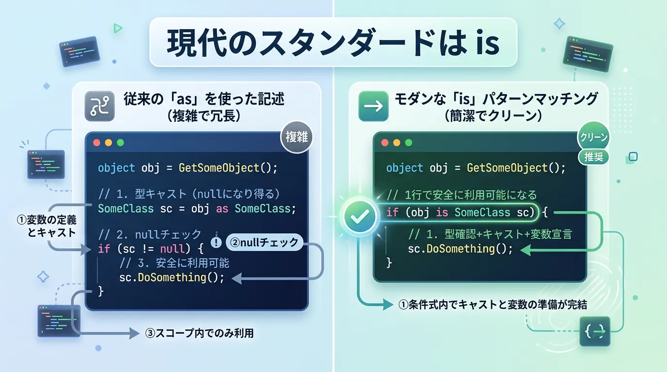 かつては「速度のas、判定のis」といった使い分けが語られましたが、現代のC#においては「パターンマッチングとしてのis」が主役となっています。