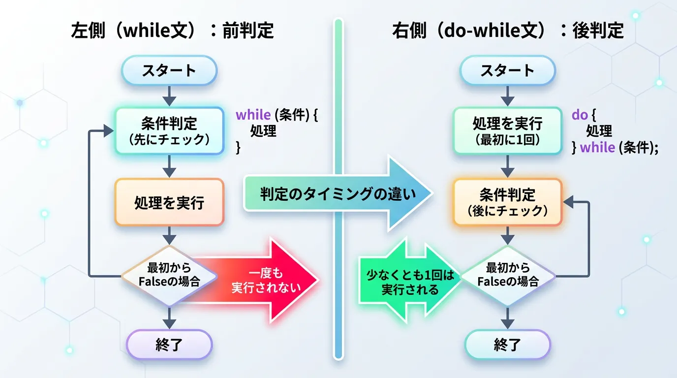 本記事では、初心者の方でも迷わず使いこなせるよう、do-while文の基本構文から、一般的なwhile文との決定的な違い、そして実戦で役立つ具体的な活用シーンまで、図解を交えて徹底的に解説します。