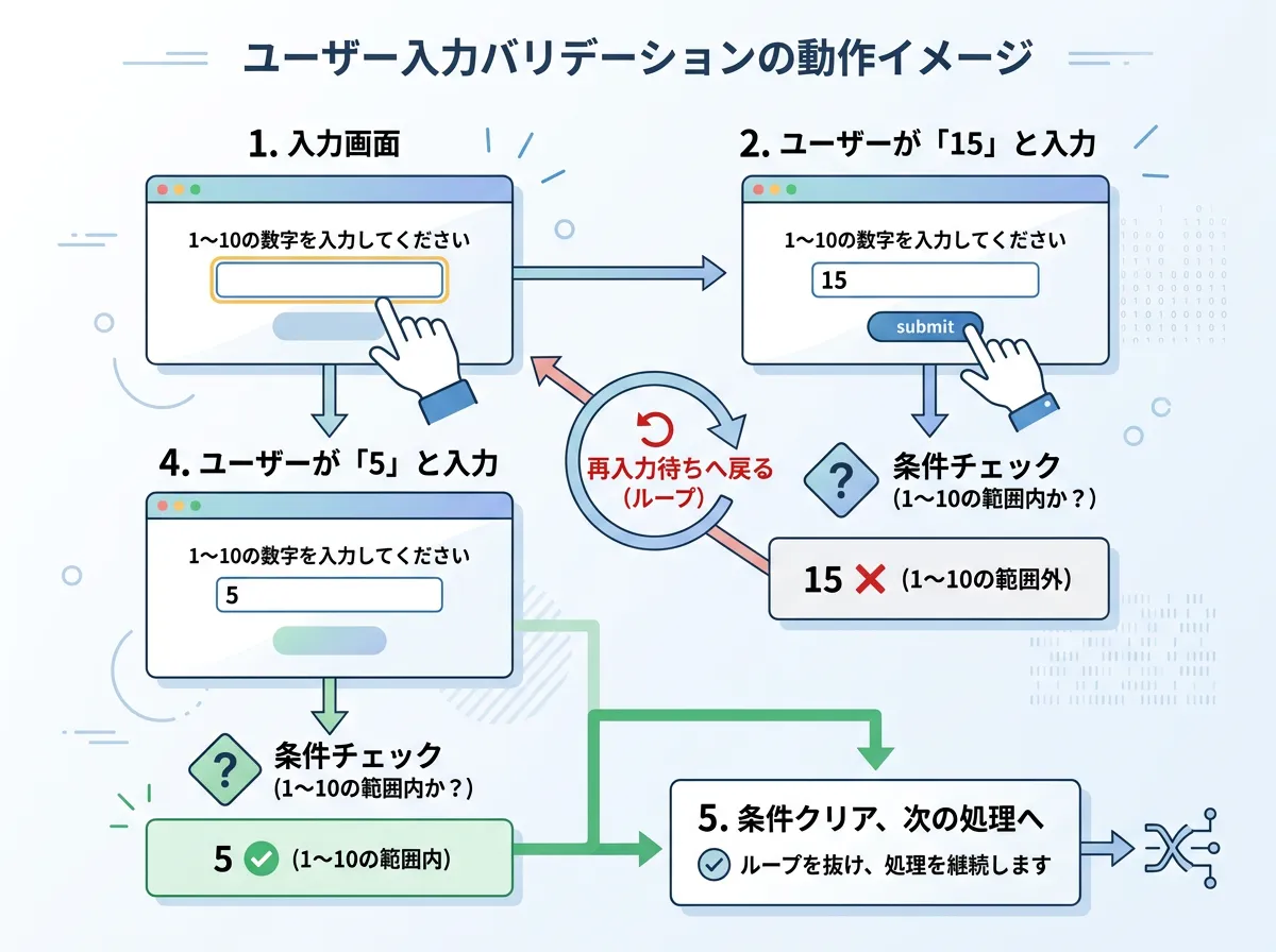 もし不適切な値が入力された場合のみ、whileの条件式によってループが継続される仕組みです。