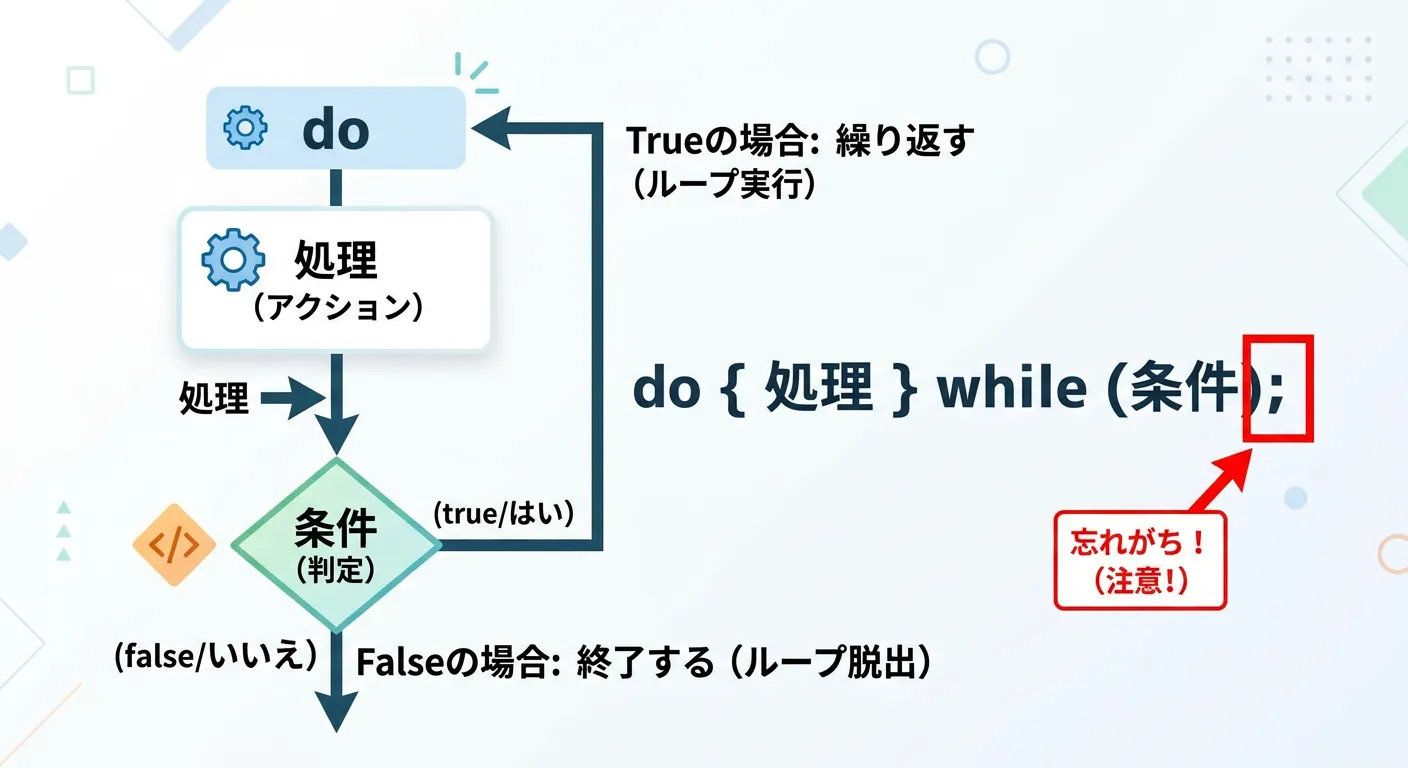 もし条件がtrueであれば再びdoの先頭に戻り、falseであればループを抜けて次の処理へ進みます。