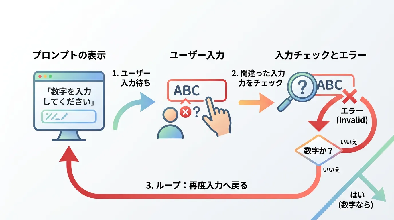 正しくない入力(数値以外や範囲外の数値)があった場合にのみ、再度ループの先頭に戻って入力を促します。