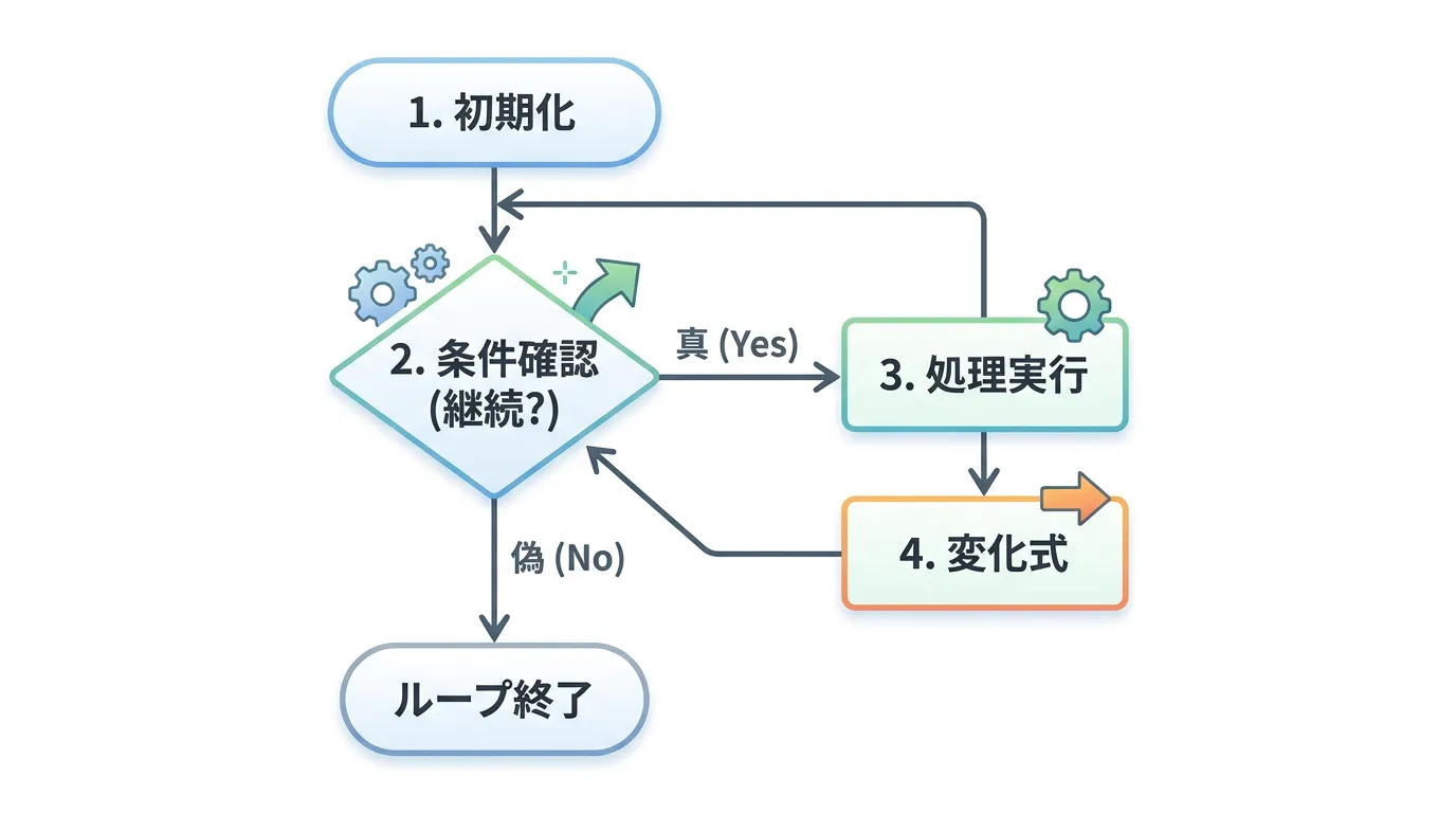 - 初期化式:ループ開始時に1回だけ実行されます。通常はカウンタ変数の宣言を行います。