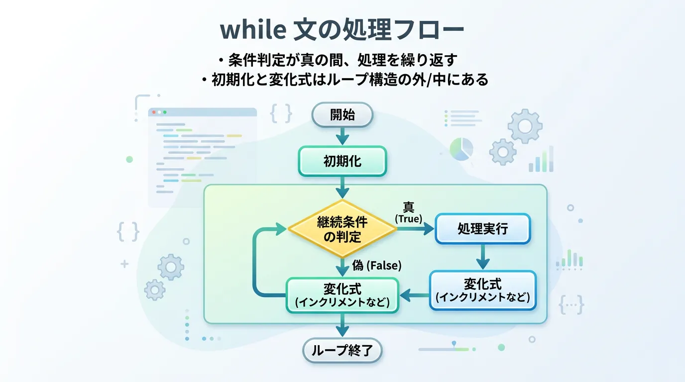 特定の条件が満たされている間、ひたすら処理を繰り返すという性質を持っています。