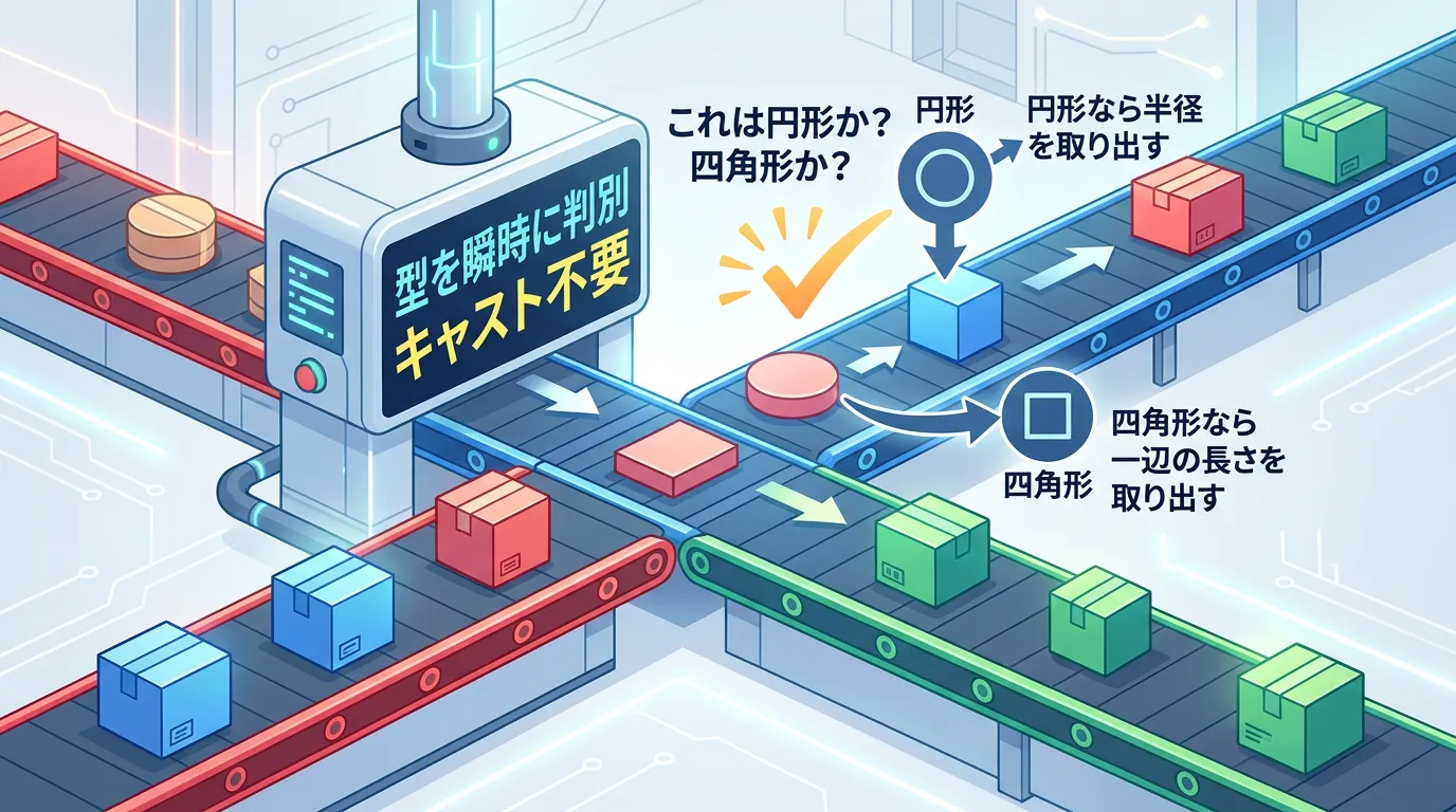 - 型パターンにより、判定とキャストを同時に行い安全性を高める。