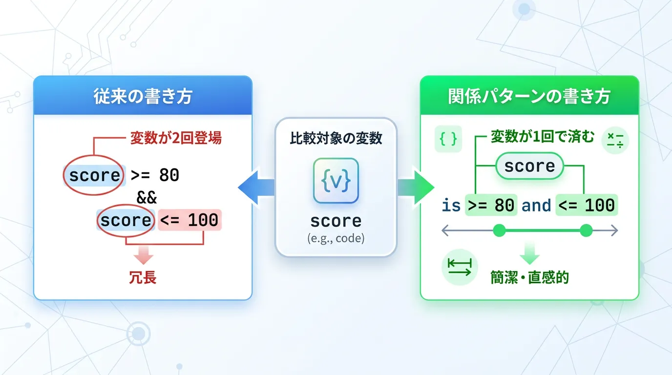 - 関係パターンは、比較演算子をパターンとして扱う機能である。