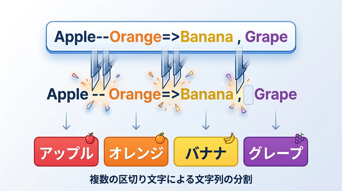 これにより、一度の呼び出しで複数の異なる文字を区切りとして認識させることが可能です。