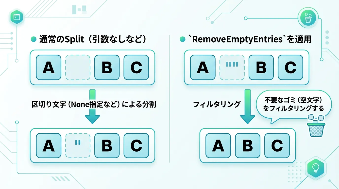 RemoveEmptyEntries | 分割結果から長さ0の文字列(空文字)を除外します。 |
