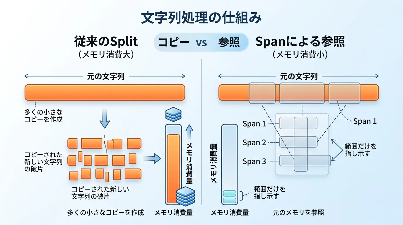 直接Splitで配列を作るのではなく、文字列の「範囲」を参照することで、ガベージコレクション(GC)の負荷を大幅に軽減できます。