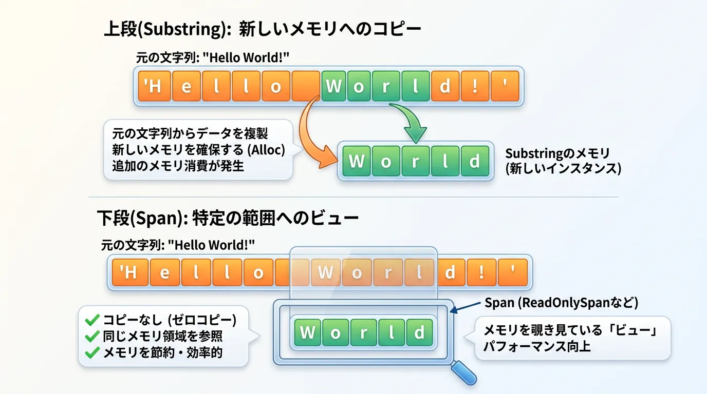Substringは新しい文字列を生成(コピー)しますが、Spanを使用すると「元の文字列の特定の範囲を指し示す」だけなので、メモリのコピーが発生しません。