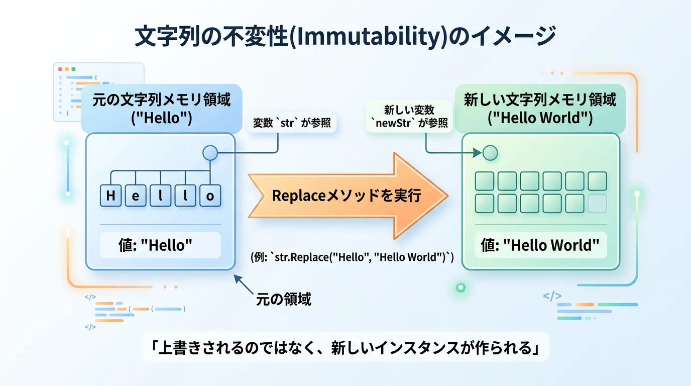 C#において文字列(string)を扱う際、まず理解しておくべき重要な概念が「イミュータブル(不変性)」です。