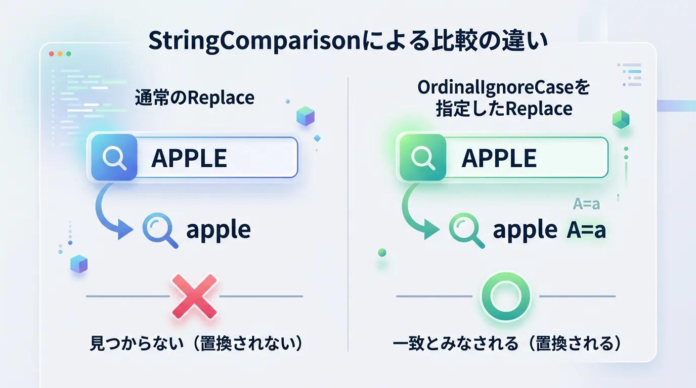 デフォルトのReplaceメソッドは、大文字と小文字を厳密に区別します。