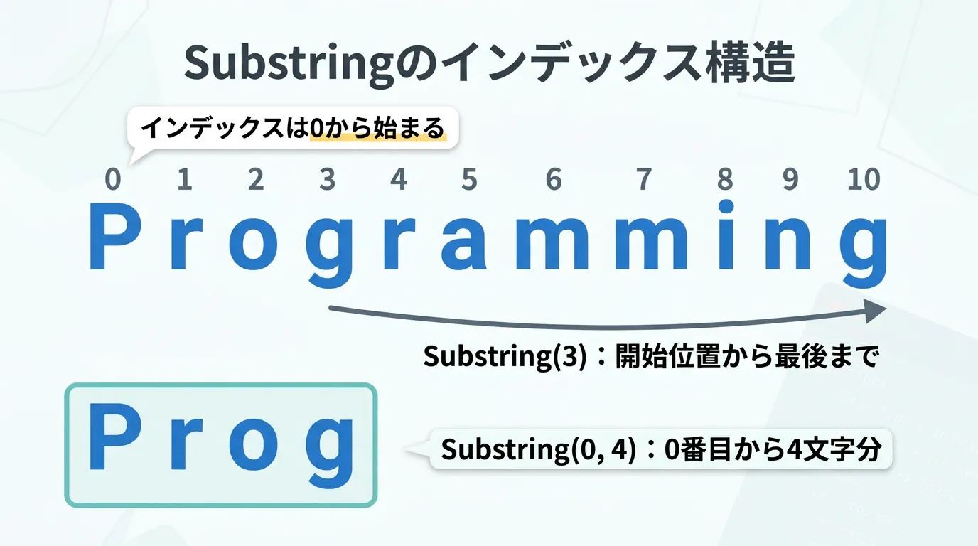 Substring(開始インデックス, 長さ)開始位置から指定した文字数分だけ切り出す
