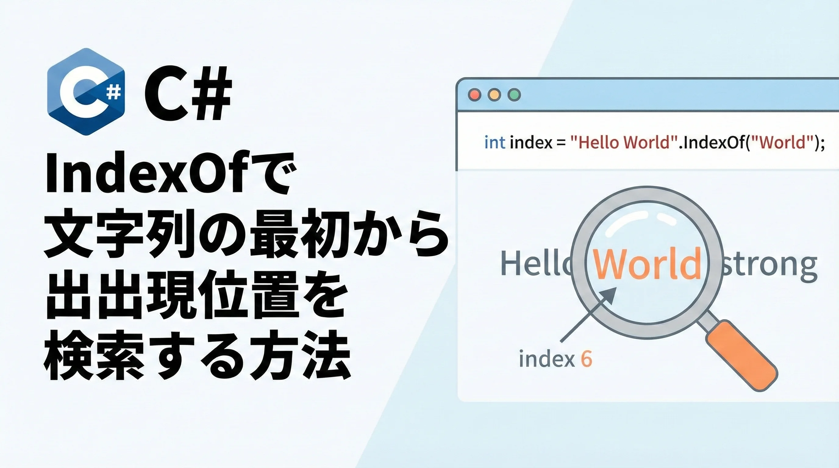 IndexOfメソッドは、文字列(string)や文字の配列の中から、指定した文字列や文字が最初に出現する位置を「0から始まるインデックス(整数)」で返すメソッドです。