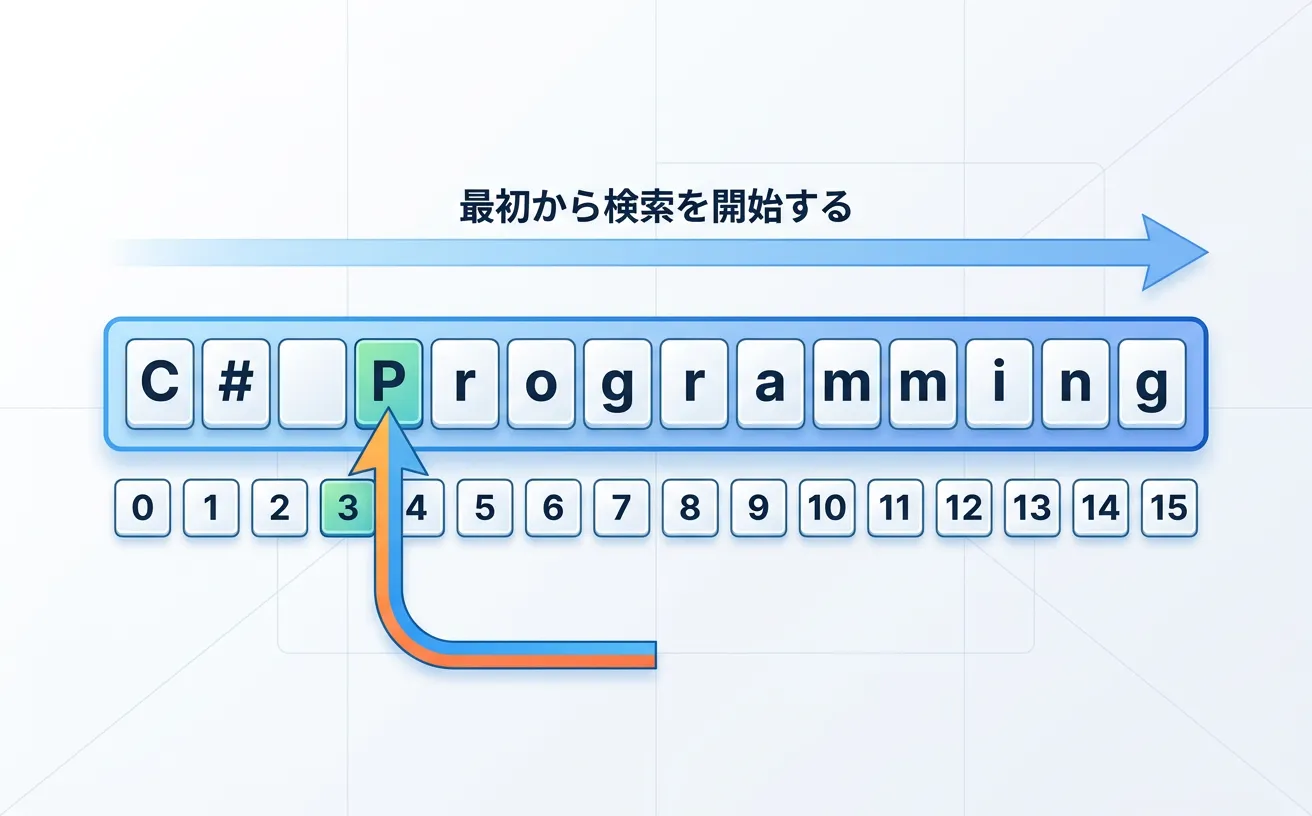 ただ位置を返すだけでなく、開始位置の指定や比較ルールの指定(StringComparison)を組み合わせることで、非常に柔軟な検索が可能になります。