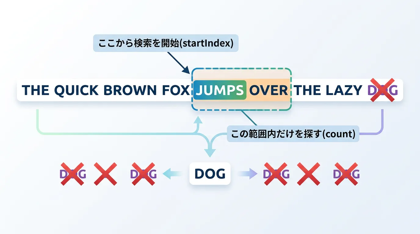これにより、2番目以降に出現する文字列を探したり、特定の範囲内だけを効率的に検索したりすることが可能になります。