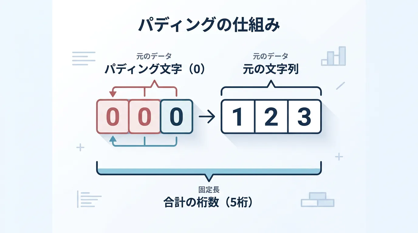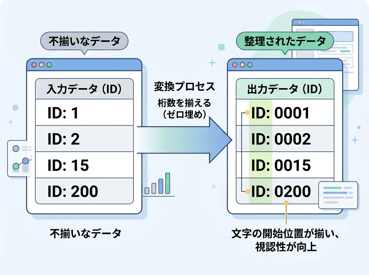 例えば、社員番号を「0001」のように4桁で統一したり、ログ出力の時間を「09:05」のように2桁で固定したりする場合です。