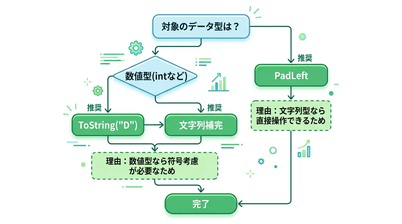 データの型や「負の数をどう扱うか」という要件に応じて、PadLeftと数値フォーマットを適切に使い分けることが、バグの少ない綺麗なコードへの近道です。