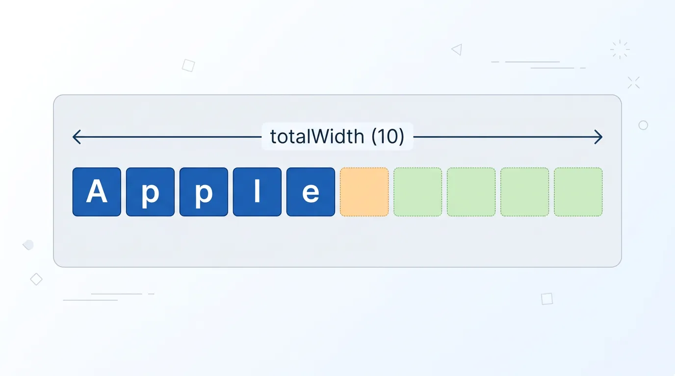 - 「Apple」は5文字なので、右側に10個の空白が追加されます。