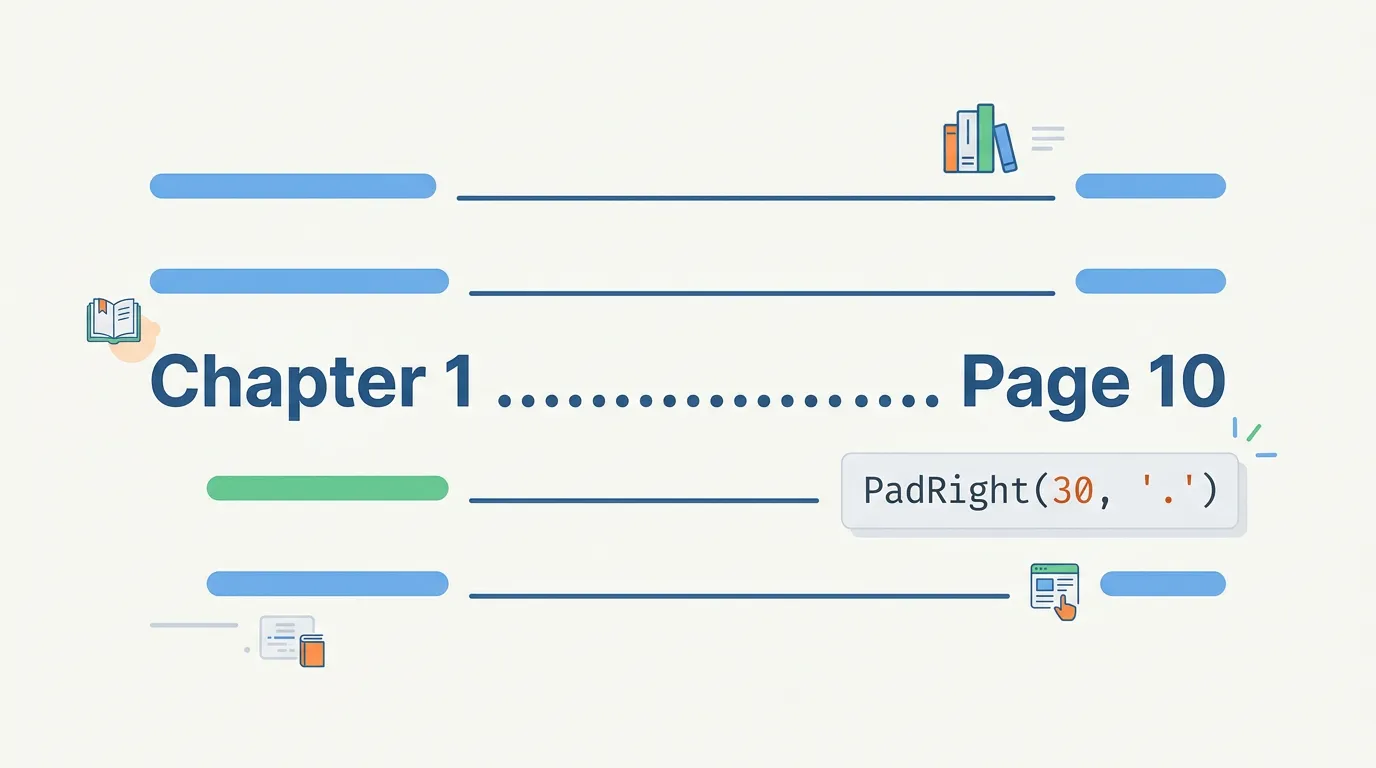 Console.WriteLine("Chapter 1".PadRight(20, '.') + "p.15");