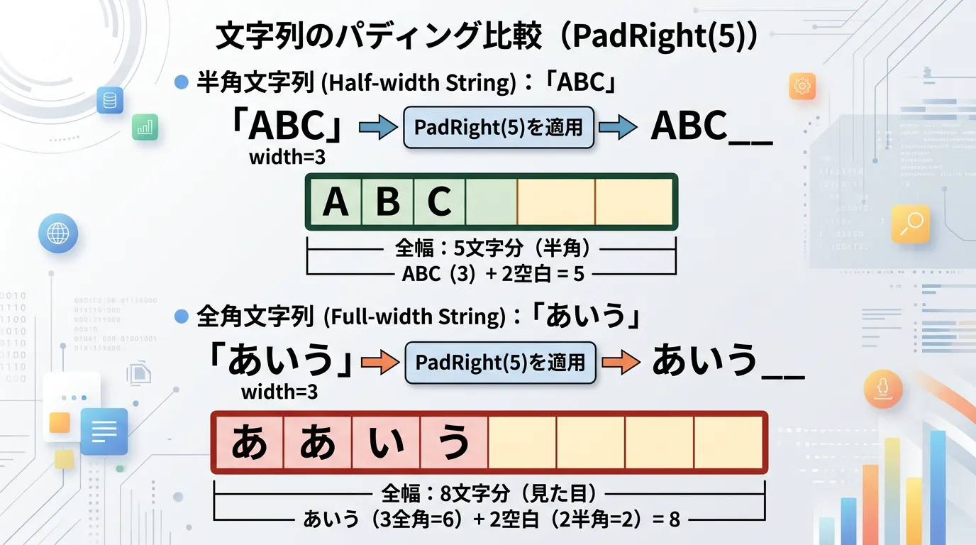 C#のLengthプロパティやPadRightメソッドは、文字の「見た目の幅」ではなく「文字数」を基準に動作します。