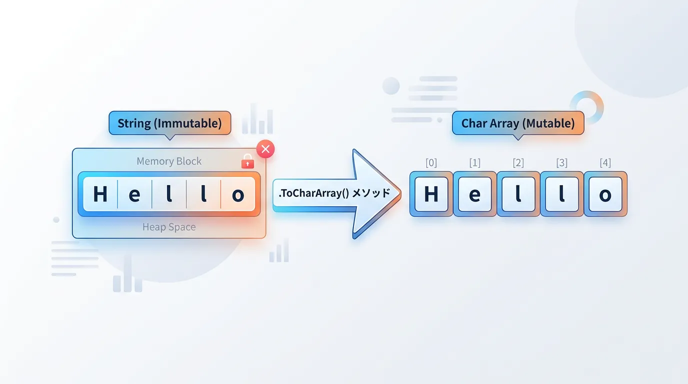 C#のToCharArrayメソッドは、不変である文字列を可変な文字配列へと橋渡しする非常に便利なツールです。