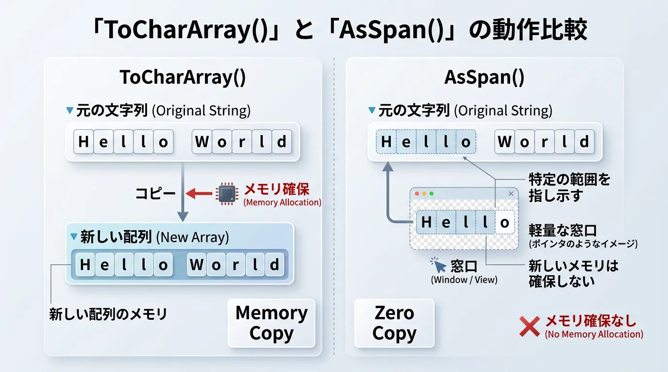 AsSpan() | メモリコピーなしで参照 | 高パフォーマンスな読み取り処理 |