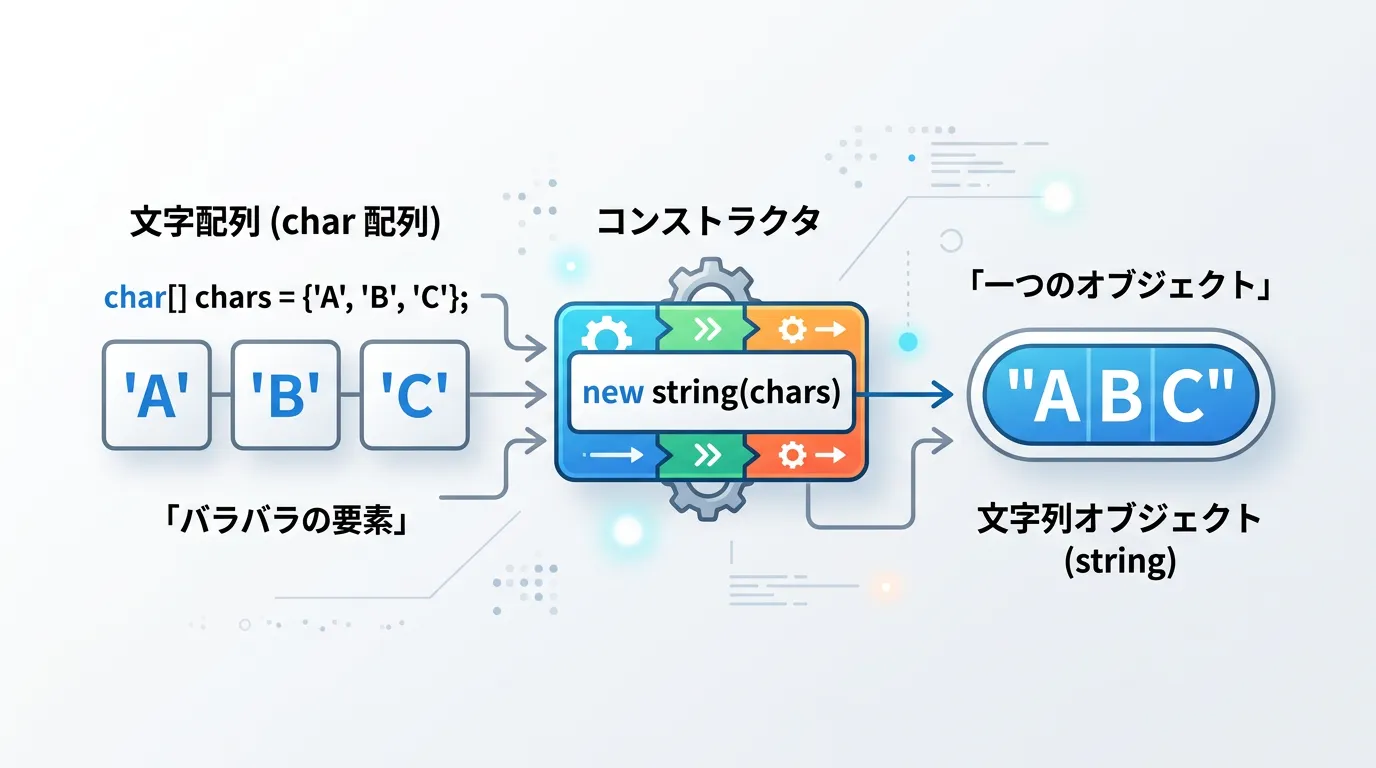 文字配列を引数に取るnew string(char[])を使用することで、配列内の全要素を連結した新しい文字列を生成できます。