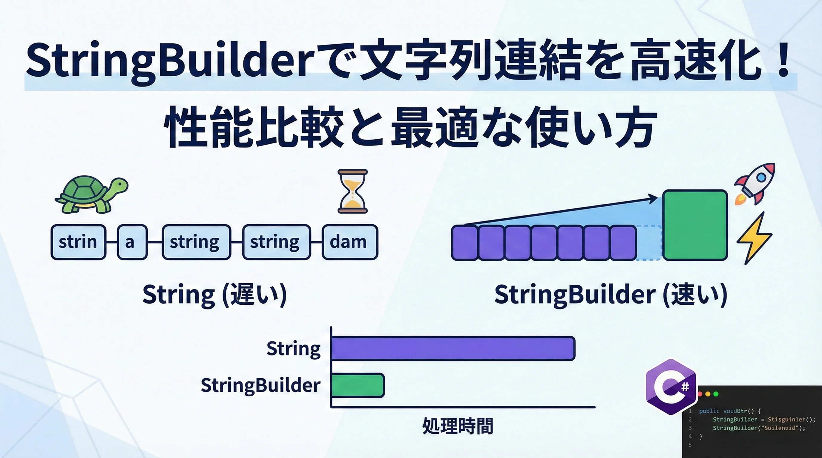 本記事では、文字列連結を高速化するための強力な武器であるStringBuilderに焦点を当て、その仕組みから具体的な性能比較、そして現場で役立つ最適化テクニックまでを詳しく解説します。