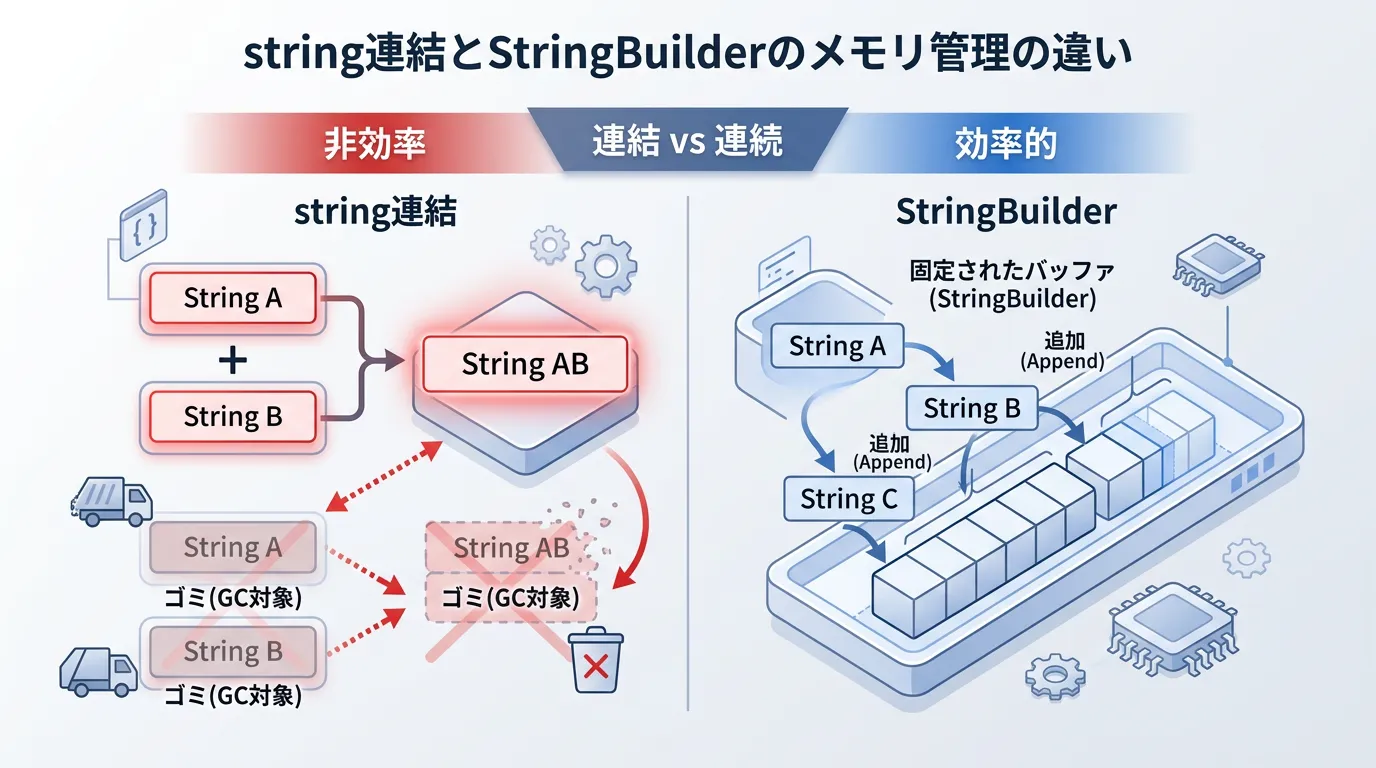 StringBuilderを適切に活用することで、不必要なメモリ確保を抑制し、ガベージコレクションの負荷を下げることができます。