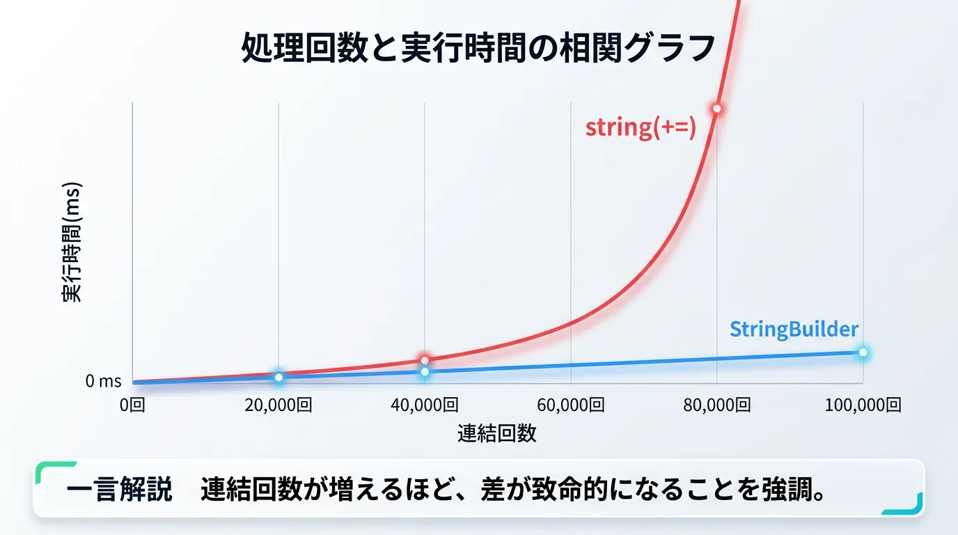 通常の+演算子は手軽で読みやすい反面、ループ処理内では「隠れたパフォーマンスの敵」となり得ます。