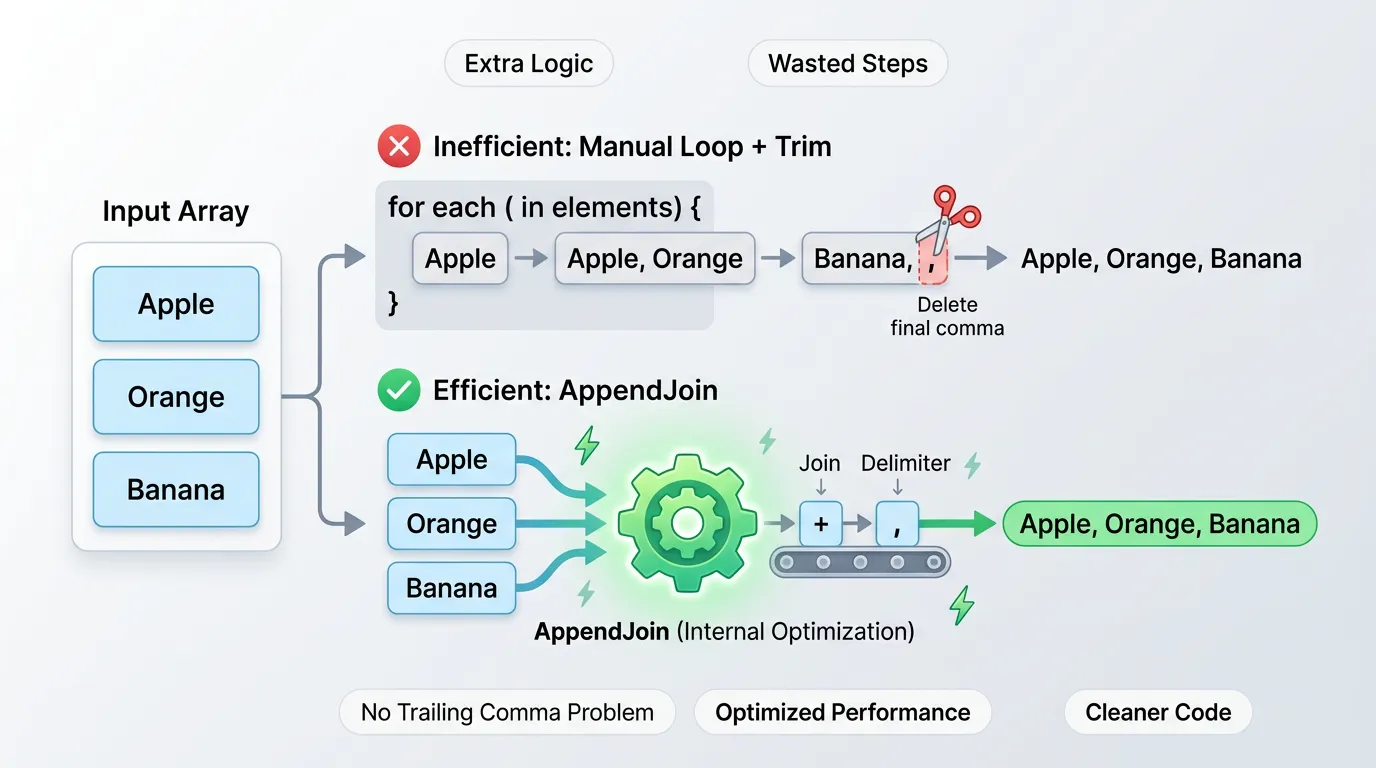 手動でループを回してAppendし、最後に余計なカンマを削除するといった煩雑なコードを書く必要がなく、可読性と速度の両立が可能です。