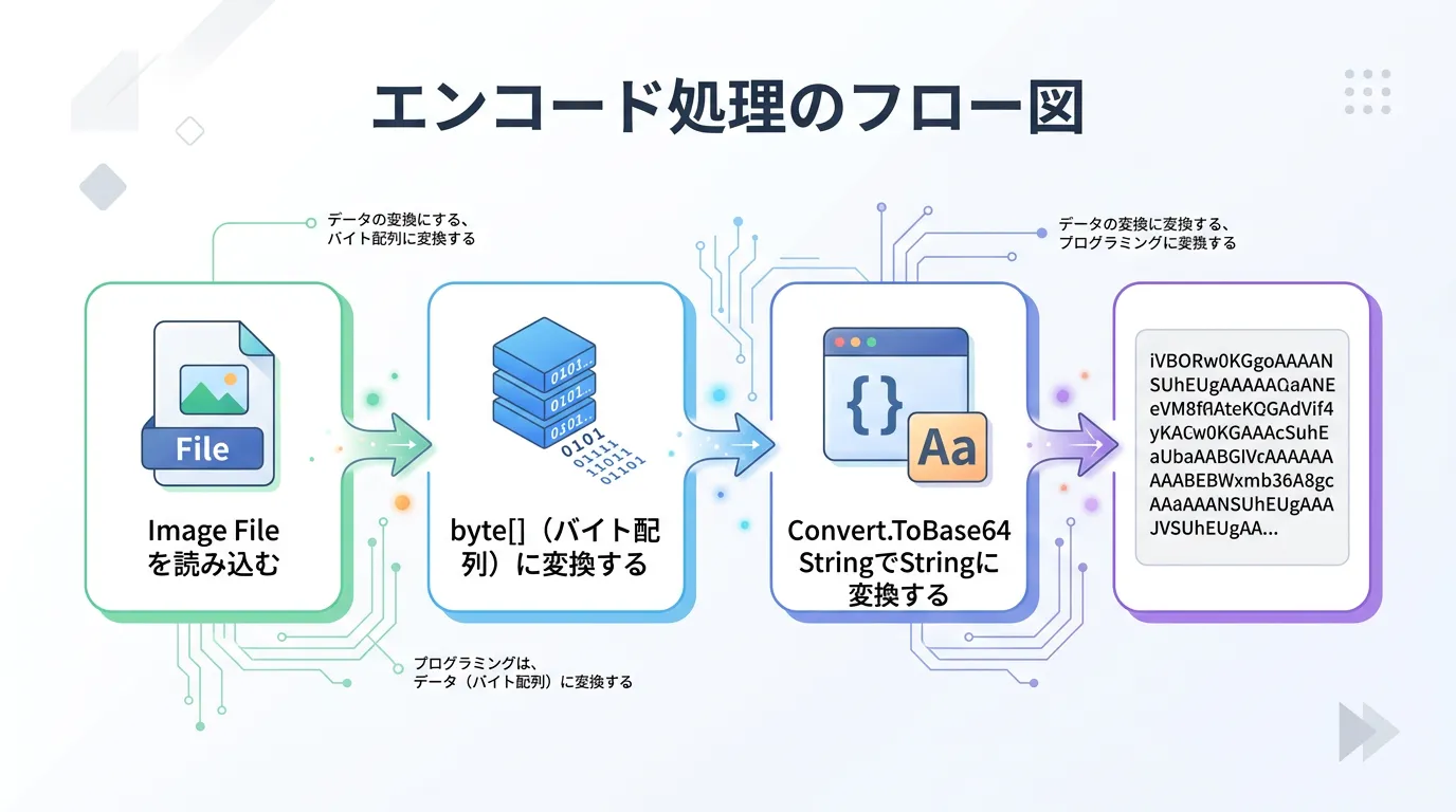 C#で画像をBase64エンコード・デコードする方法は、Convertクラスを利用する基本的なものから、Span<T>を利用した高度な最適化まで多岐にわたります。