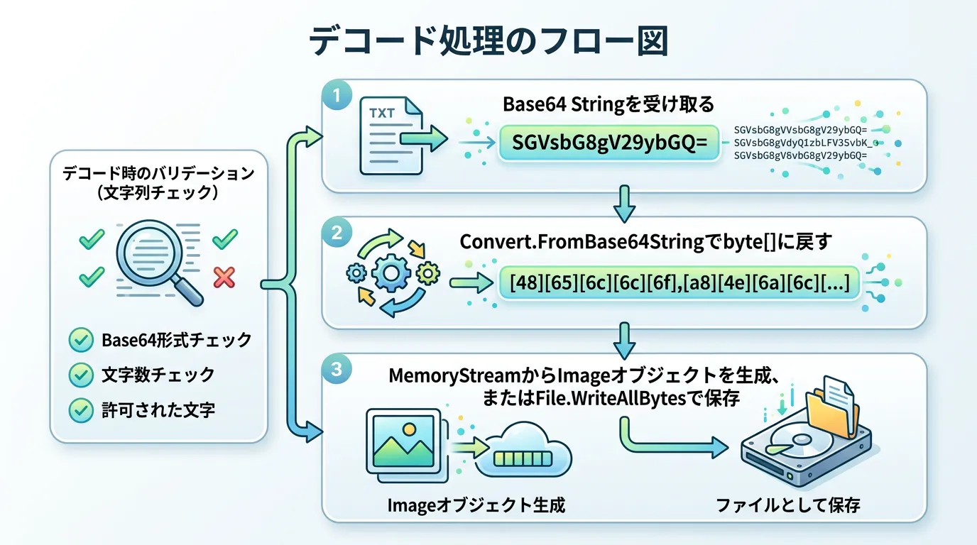 次に、受信したBase64文字列を元の画像に戻す「デコード」の処理について解説します。