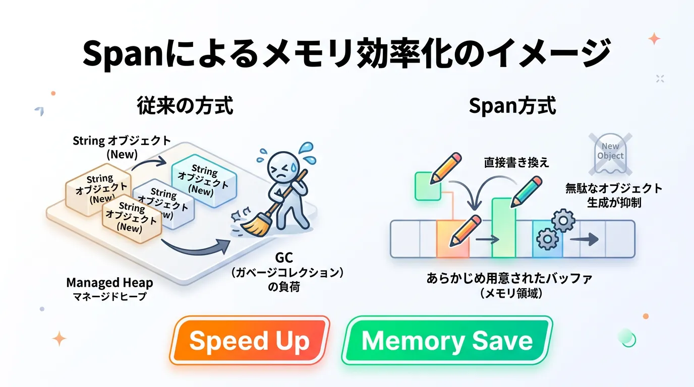 .NET Core 2.1以降、および現在の.NET 8/9環境では、メモリ効率を劇的に向上させるSpan<T>やReadOnlySpan<T>を活用した新しいAPIが導入されています。