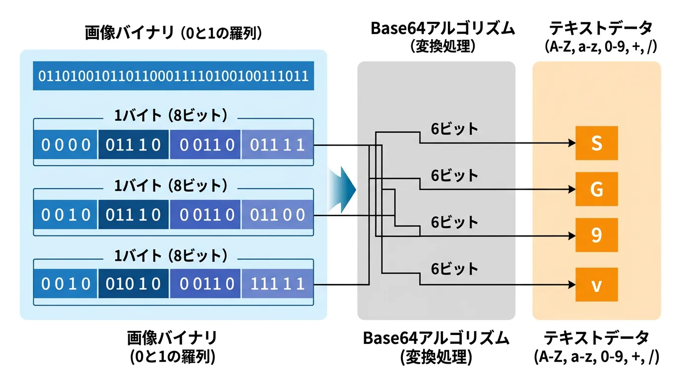 このような際、バイナリデータである画像をテキスト形式に変換する手法としてBase64エンコードが広く利用されています。