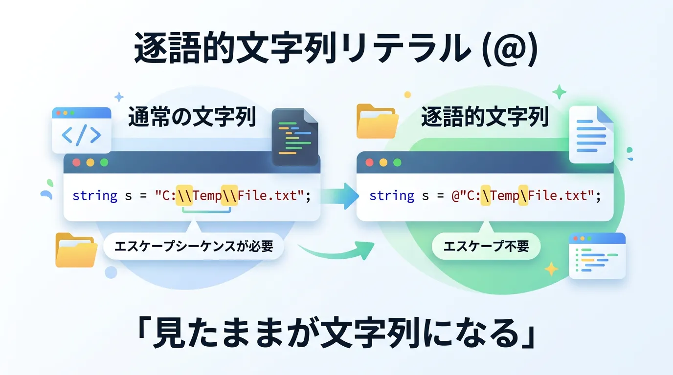 逐語的文字列リテラルは、文字列内の文字をその見た目通り(逐語的)に扱うための仕組みです。