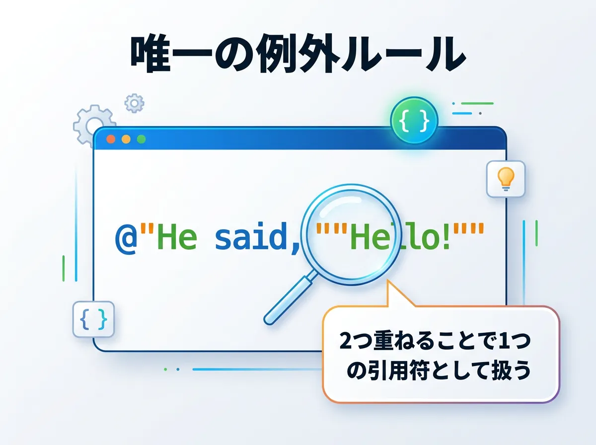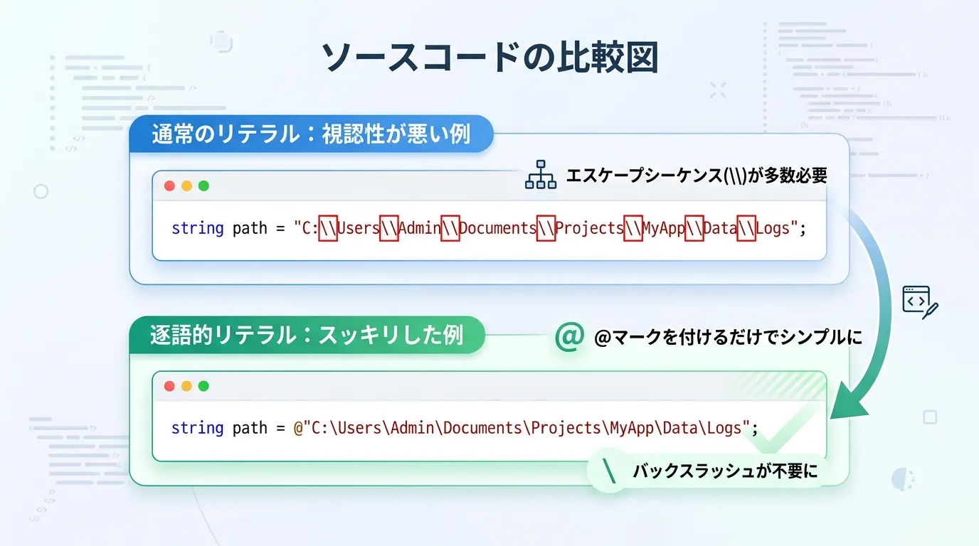 文字列の先頭に @ 記号を付与するだけで、エスケープ処理の煩わしさから解放され、直感的でメンテナンス性の高いコードを記述することが可能になります。