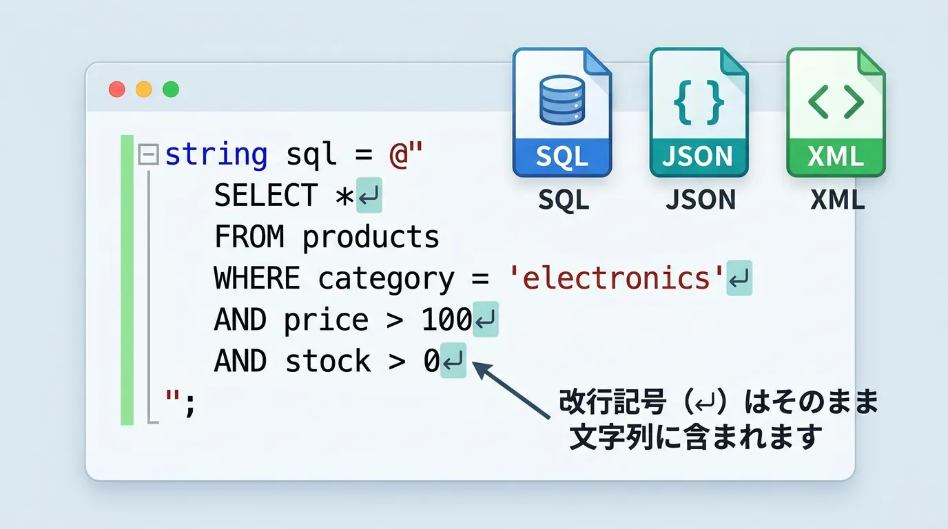 • より複雑な構造(大量の引用符やインデント保持)が必要な場合は、C# 11の未加工文字列リテラルを検討する。