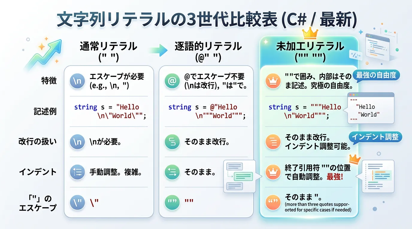 本記事では、逐語的文字列リテラルの基礎から、最新のC#における応用的な使い方までを徹底的に解説します。