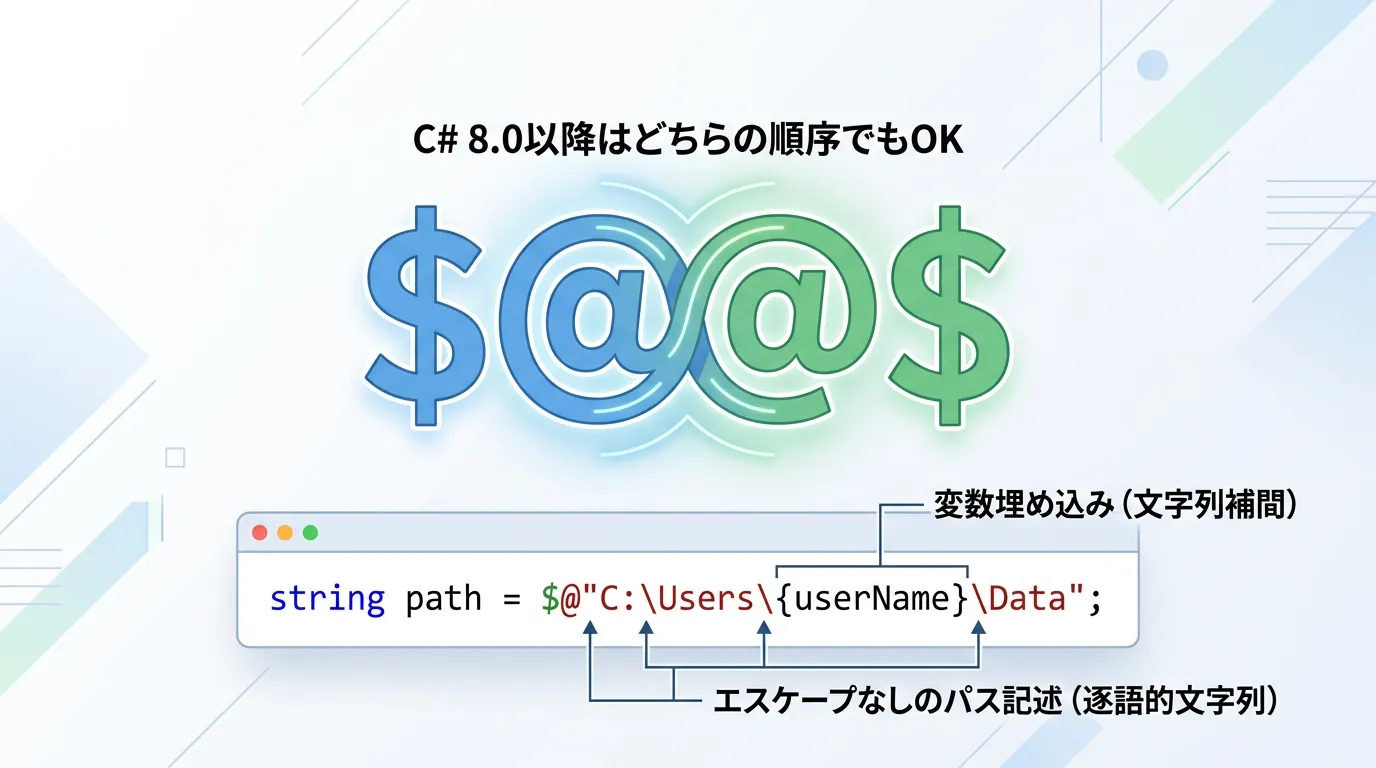 C# 8.0以降では、$@""@$"" のどちらの順序で記述しても正しく動作します(それ以前のバージョンでは $@ の順序のみでした)。