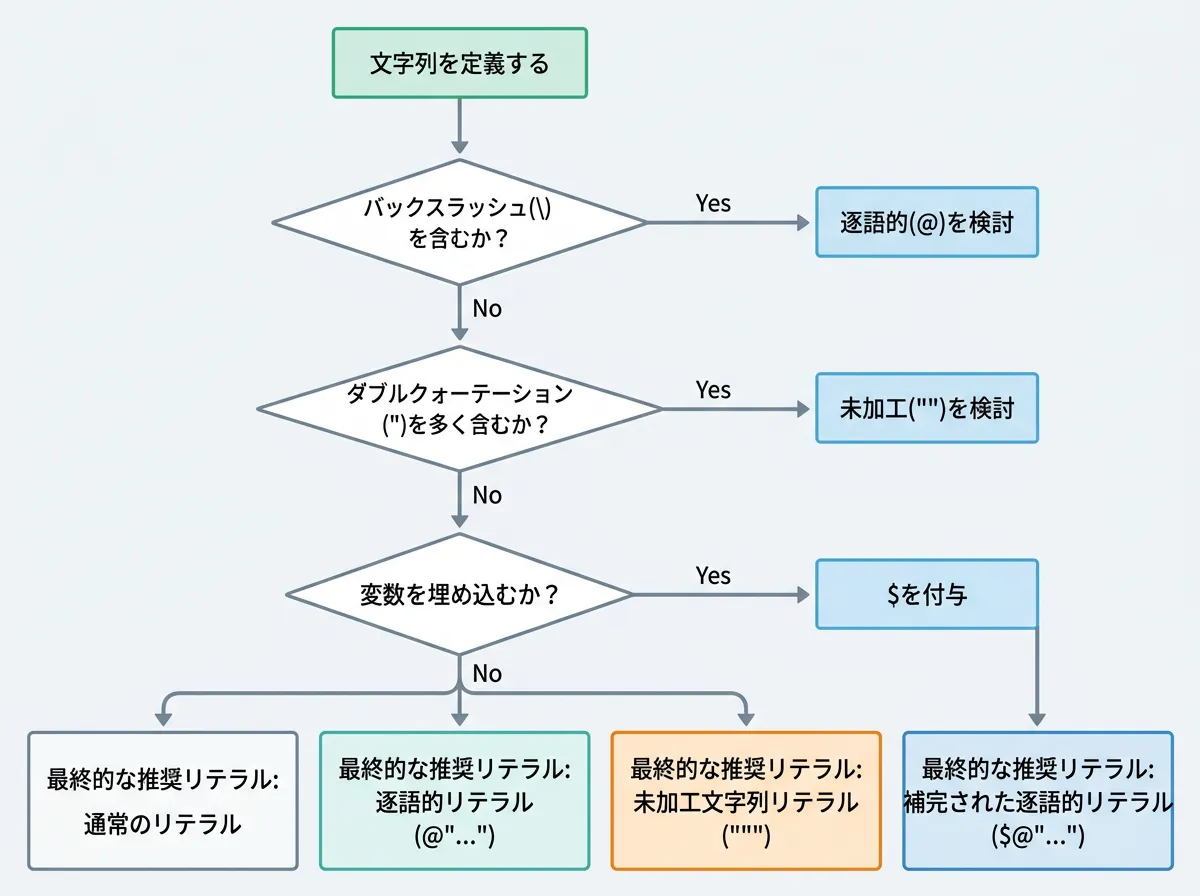 逐語的文字列リテラルを効果的に使い分けるためのガイドラインを整理します。