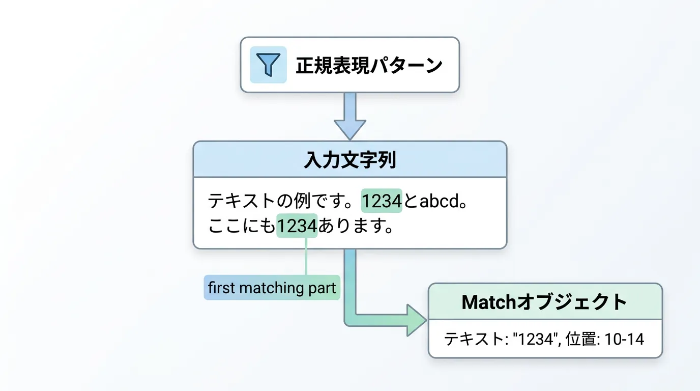 このメソッドは、指定した入力文字列の中から正規表現パターンに一致する 最初の箇所 を探し出し、その結果を Match オブジェクトとして返します。