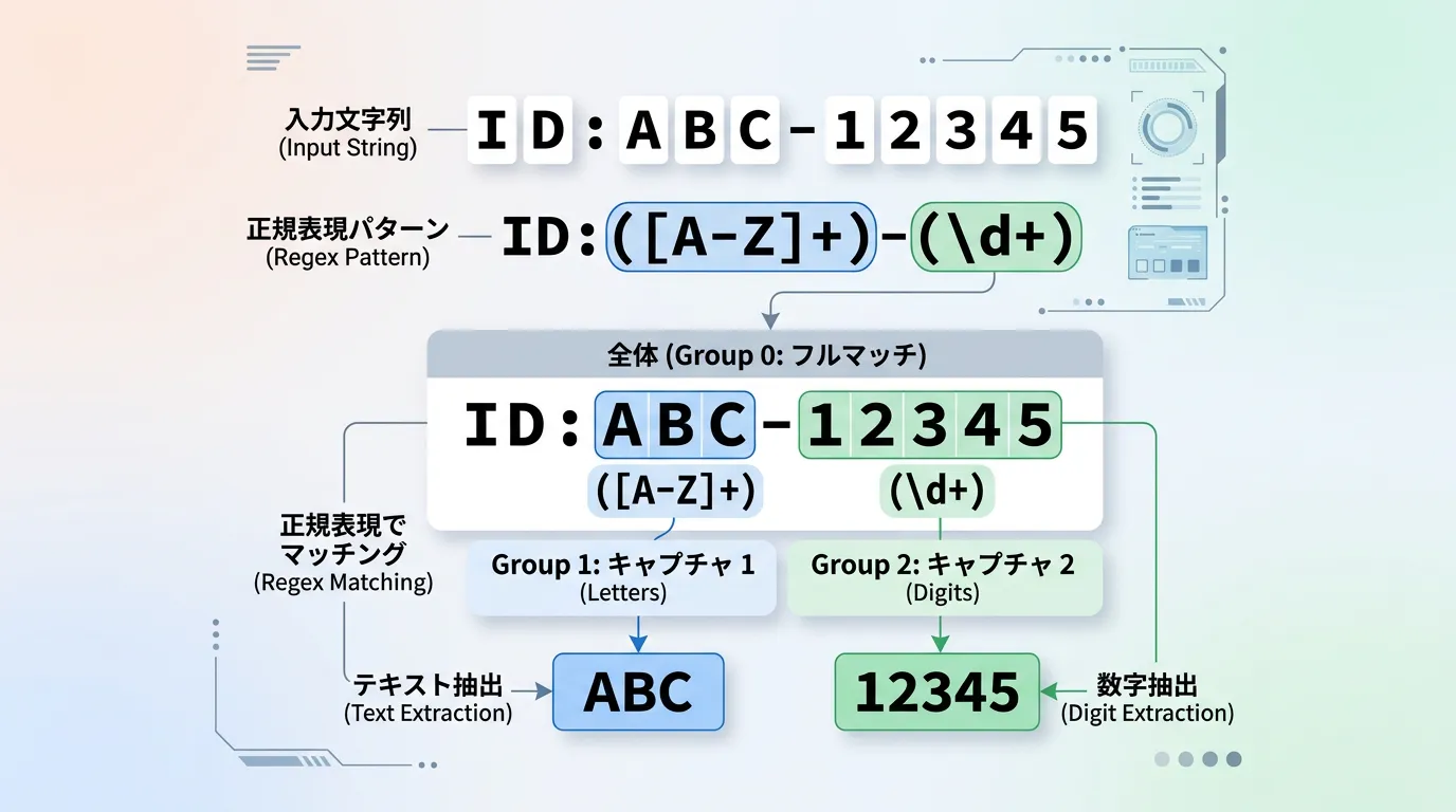 正規表現の真価は、単にパターン全体にマッチさせるだけでなく、「パターンの一部だけを取り出す」ことにあります。