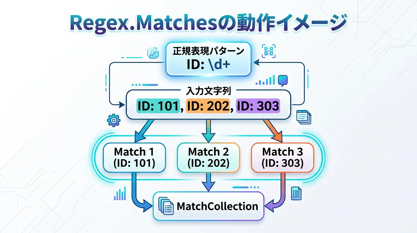 Regex.Matchesは、入力文字列の中から特定のパターンに一致するすべての部分を探し出し、MatchCollectionというオブジェクトで結果を返すメソッドです。